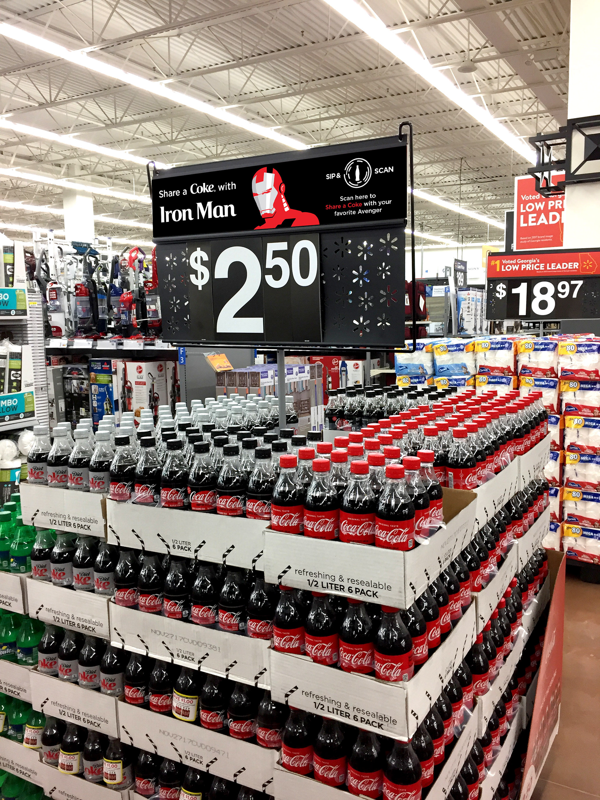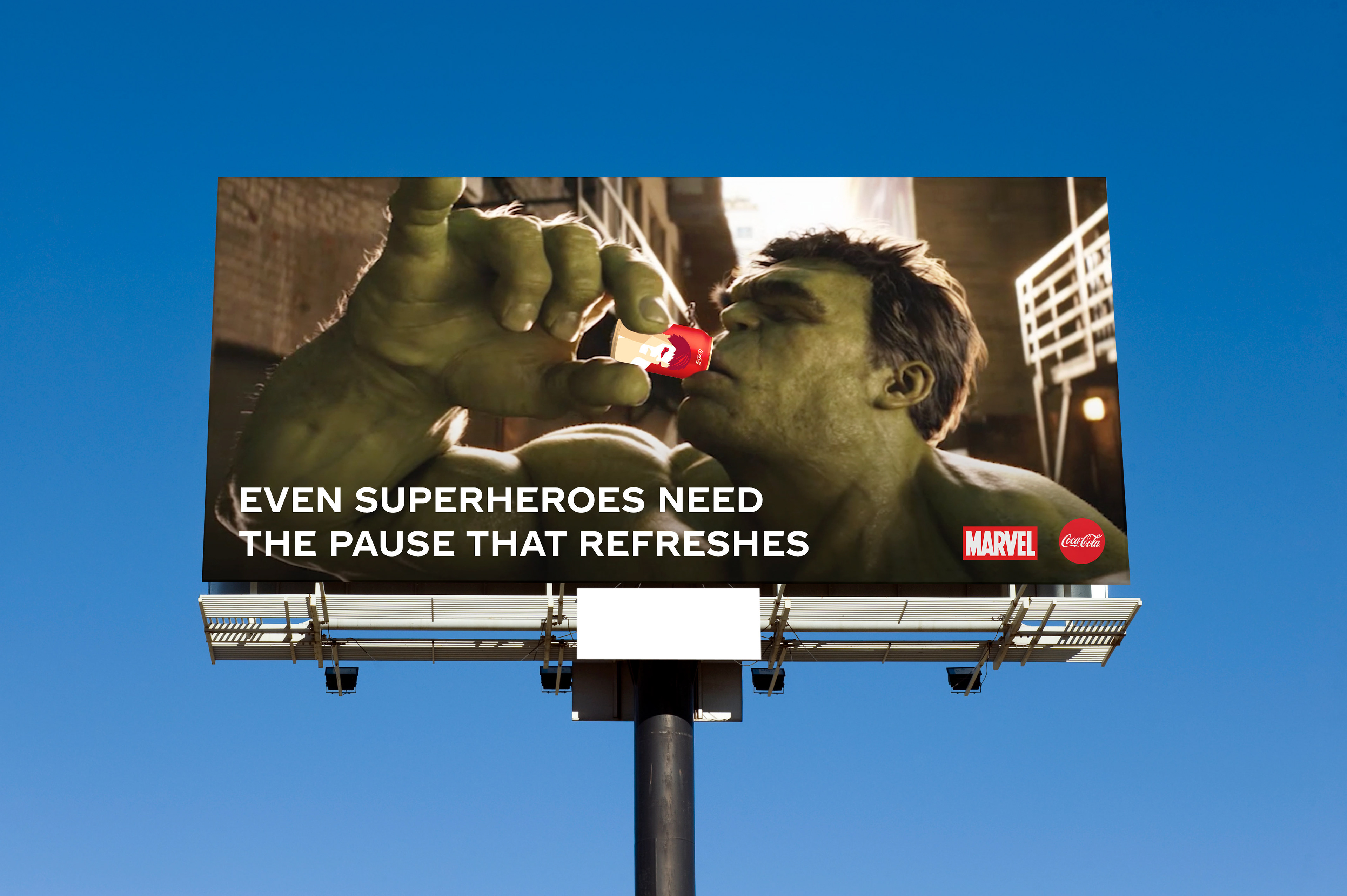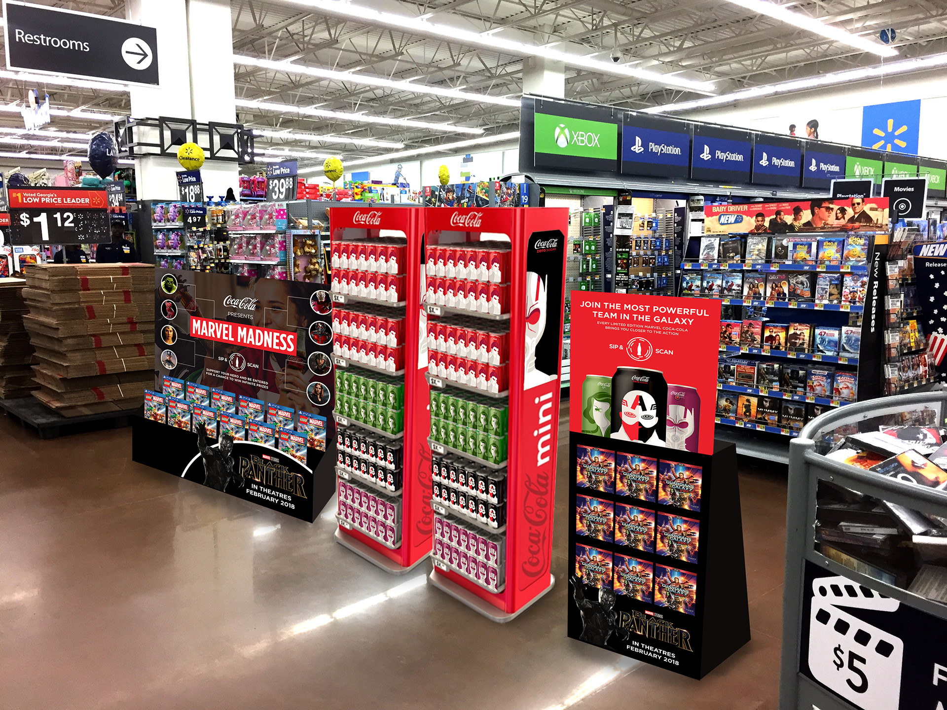 Mockups of products, store displays, and other activations for a potential Marvel + Coca-Cola collaboration (superhero illustrations were provided).